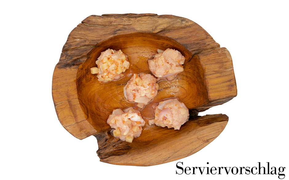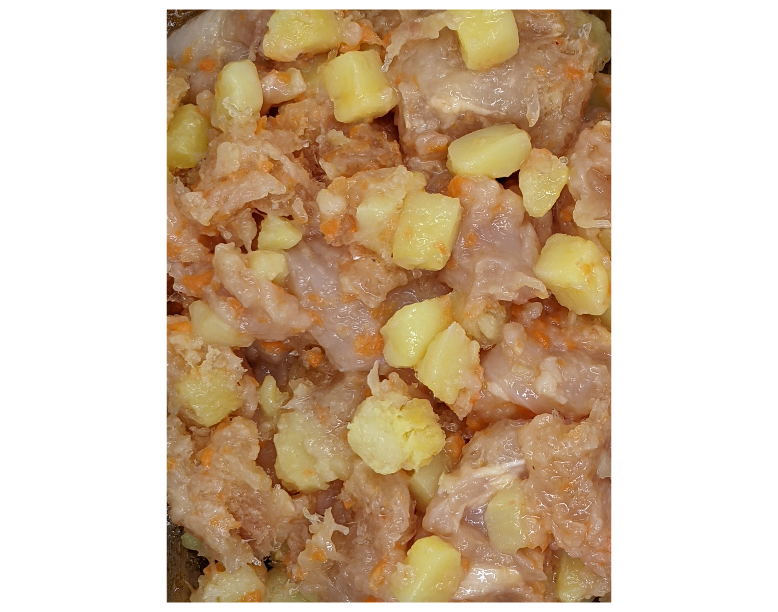 Zarte, sehr magere Bruststücke vom Hähnchen mit 35% vorgegarter Kartoffel und 5% Möhre zu 500g verpackt.