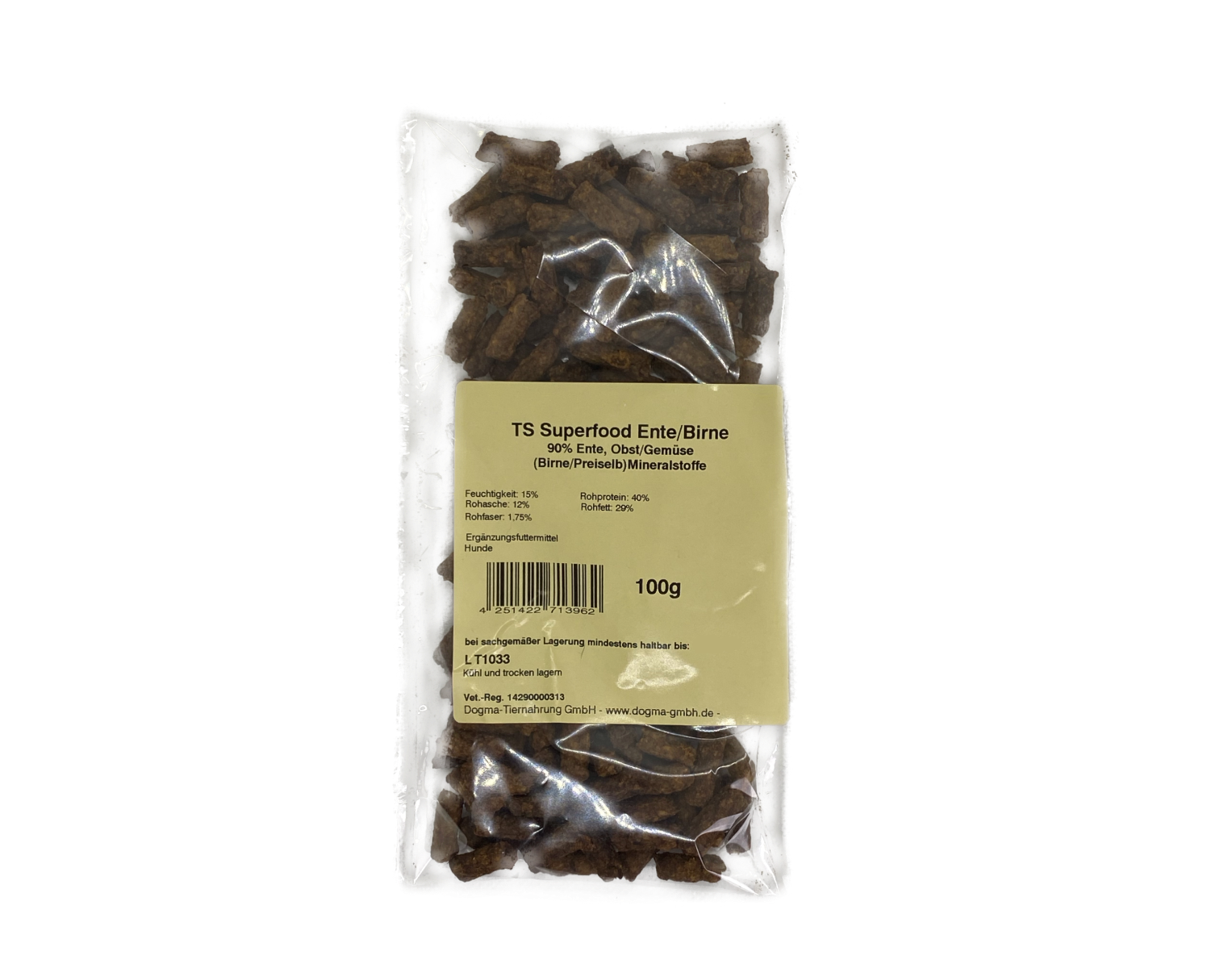 Zusammensetzung: 90% Entenfleisch (keine Innereien), 3% Birnen, 3% Preiselbeeren und Mineralstoffe - schonend getrocknet